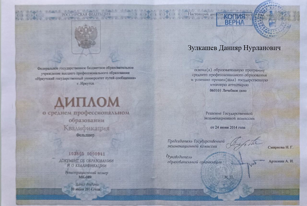Меня зовут Зулкашев Данияр Нурланович, я — фельдшер выездной наркологической бригады в наркологической клинике "Плюс" в Хороле. Я стремлюсь помогать людям, оказывая квалифицированную медицинскую помощь в самых разных ситуациях, и верю, что каждый пациент заслуживает внимания и поддержки на пути к выздоровлению.